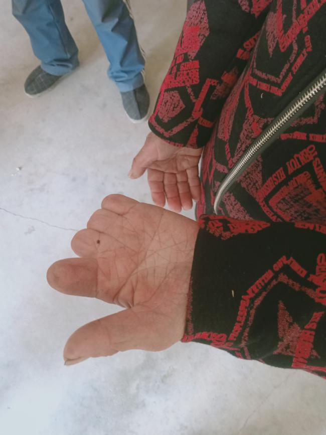 66岁那年,高杏宝在厂里上班时左手被机器辗轧,四个手指头齐刷刷被轧掉,如今只剩下光秃秃的手掌。
